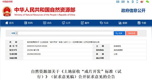 10月21日,自然資源局發(fā)布關(guān)于《土地征收“成片開發(fā)”標(biāo)準(zhǔn)(試行)》(征求意見稿)公開征求意見的公告,對《土地管理法》中涉及的土地征收“成片開發(fā)”的相關(guān)內(nèi)容進(jìn)行細(xì)化。