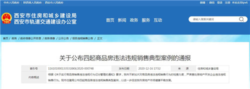 房訊網(wǎng)訊 為進一步促進房地產(chǎn)市場健康平穩(wěn)發(fā)展,近日,西安市住建局公布四起商品房違法違規(guī)銷售典型案例,根據(jù)《關(guān)于實行商品房銷售違法違規(guī)行為記分管理的通知》(市房發(fā)〔2017〕64號)要求,西安市不斷加大對商品房違法違規(guī)銷售行為的檢查力度,嚴肅查處房地產(chǎn)開發(fā)企業(yè)違法違規(guī)銷售行為。