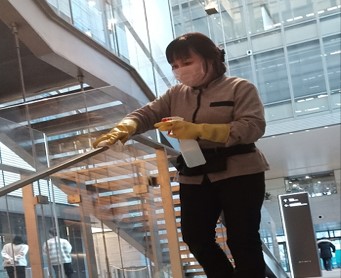 一是在客戶入門排隊等候測溫時,設計了蛇形通道、標志測溫等候區和測溫區標識,幫助客戶有序排隊,增加等候體驗;二是在測溫臺和立體車庫等一些區域配備了消毒紙巾、一次性手套等,滿足客戶的多元需求;三當客戶有廢棄的口罩或需要處理的個人物品時,項目還在一層臺面、大廈東側外圍的口罩回收處備有一次性塑料袋供客戶自取使用,減少交叉感染風險;四為避免電梯成為樓宇病菌傳播的渠道,項目在每個大堂電梯前室都配備了免洗洗手液供客戶入梯前使用,防止交叉感染。并通過張貼宣傳通知、電梯內部滾動播放宣傳片、標志每日消毒頻次,做到消毒工作可視化,讓客戶安心使用電梯;五項目還通過Coffice智慧辦公平臺,開通線上訂餐功能并提供每日菜單、客流情況等信息,鼓勵錯峰就餐、自備餐具或打包帶走,減少用餐時人員聚集情況,同時生態食集實行一人一桌分餐制,降低飛沫傳播風險。