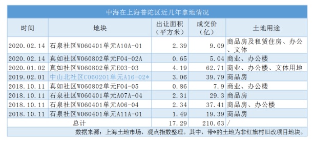 中海在2018年10月通過舊改項目布局上海普陀區,位于該區域內的紅旗村改造項目地塊均被中海包攬。截至目前,中海已在上海普陀區拿下8宗地塊,成交價達到210.63億元。