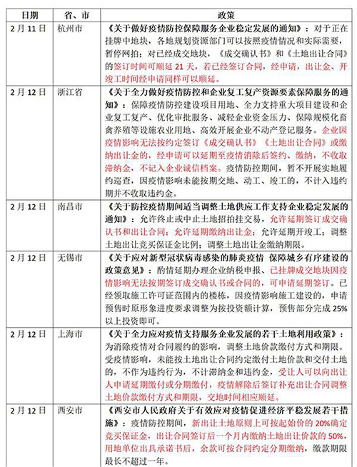 據(jù)不完全統(tǒng)計(jì),截至目前,已有無(wú)錫、廈門(mén)、衡陽(yáng)、福州等地相繼出臺(tái)政策支持房地產(chǎn)市場(chǎng)平穩(wěn)健康發(fā)展。此外,濟(jì)南、西安、杭州、上海、天津、南昌、南京、浙江等省市出臺(tái)土地新政應(yīng)對(duì)疫情,部分城市明確土地款可申請(qǐng)延期或分期繳付。