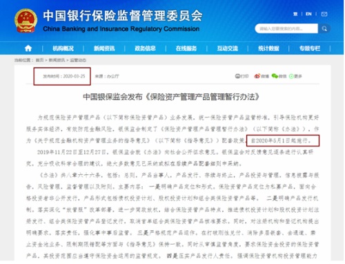3月25日下午,銀保監會發布公告,《保險資產管理產品管理暫行辦法》已于2019年7月19日通過。現予公布,自2020年5月1日起施行。《辦法》共八章六十七條,包括總則、產品當事人、產品發行設立、產品投資與管理、信息披露與報告、風險管理、監督管理和附則。