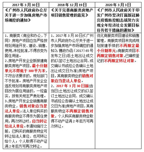 2018年12月19日,廣州市住房和城鄉(xiāng)建設(shè)委員會發(fā)布《關(guān)于完善商服類房地產(chǎn)項目銷售管理的意見》,意見提出了兩項分類措施,提出“330新政”前拿地的商服類物業(yè)不再限定銷售對象。