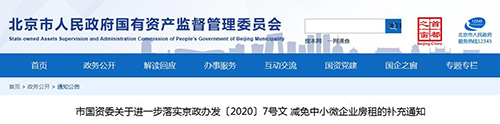 市國資委關于進一步落實京政辦發〔2020〕7號文 減免中小微企業房租的補充通知