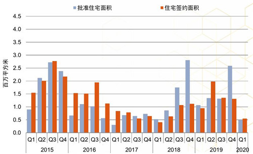 商品住宅銷售方面, 2020年北京新房市場開局不利、供需兩端均受到一定抑制。一季度,全市商品住宅新增供應量約為48.2萬平方米,環比、同比分別下滑81%、55%。同期商品住宅成交量為54.6萬平方米,環比、同比分別下滑58%、42%。受疫情影響,住宅開發中的施工、拿證、蓄客、線下銷售等環節均暫停運營,對住宅供應與銷售均形成沖擊,可以說一季度房地產銷售受到了較大影響。與此同時,中央保持房地產調控力度,堅持"房住不炒"定位不變,不將房地產作為短期刺激經濟的手段。值得關注的是,北京土地市場受疫情影響不明顯,仍然保持井然有序,一季度北京市土地市場共成交17宗,累積成交金額達602億元。