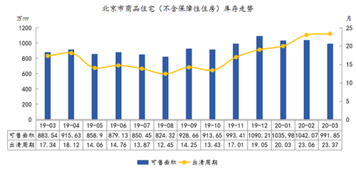 庫存方面,2020年3月,北京市商品住宅(不含保障性住房)可售面積991.85萬㎡,環比下降4.8%,按照平均近6個月銷售情況,出清周期為23.37個月,較上月增加0.3個月。