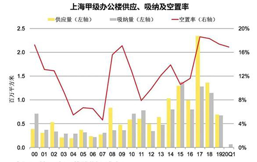 事實(shí)上,上海寫字樓市場整體空置率更甚于甲級市場。據(jù)高力國際最新統(tǒng)計(jì),一季度上海寫字樓整體空置率為19.2%,環(huán)比下降0.8個(gè)百分點(diǎn),但這一空置率預(yù)計(jì)將在2020年末達(dá)到28.9%。