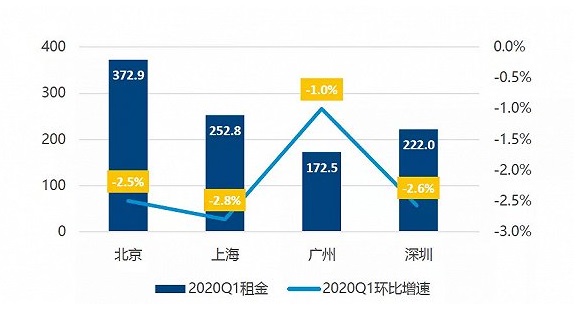 ▲一線城市2020年一季度租金走勢。來源:高力國際