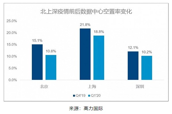 受疫情期間線上信息量激增,疊加新基建影響,數(shù)據(jù)中心成2020年投資風口。一季度北上深一線城市數(shù)據(jù)中心空置率相對于去年年底明顯降低。由于能評政策的限制,一線城市的數(shù)據(jù)中心供給較為稀缺,資本正積極尋找優(yōu)質投資標的。