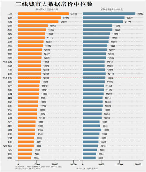 三線城市房價中位數的平均值為12282元/建筑平方米,比上月漲跌10元/建筑平方米。