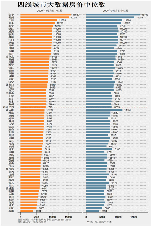 四線城市房價中位數的平均值為7961元/建筑平方米,比上月漲跌-44元/建筑平方米。