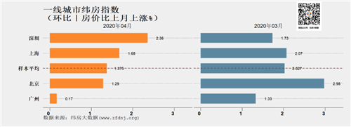 2020年4月北上廣深四個(gè)一線城市房?jī)r(jià)均出現(xiàn)上漲。其中深圳(2.36%)、上海(1.68%)、北京(1.29%)的環(huán)比漲幅均在1%以上,漲速相對(duì)較快。廣州環(huán)比上漲0.17%,市場(chǎng)相對(duì)平穩(wěn)。