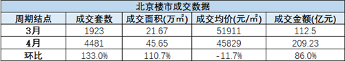 據(jù)天朗房研網(wǎng)統(tǒng)計數(shù)據(jù)顯示,4月北京成交新房4481套,環(huán)比大漲133%;成交面積45.65萬平米,環(huán)比上升110.7%;總成交額209.23億元,環(huán)比上升86%。均創(chuàng)下今年新高。