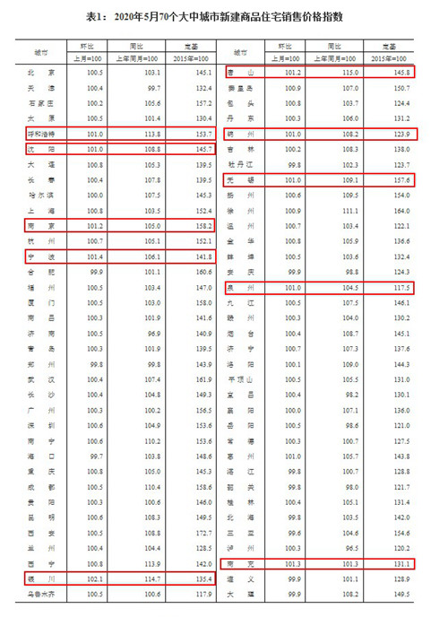 2020年5月70個大中城市二手住宅銷售價格指數。來源:國家統計局網站