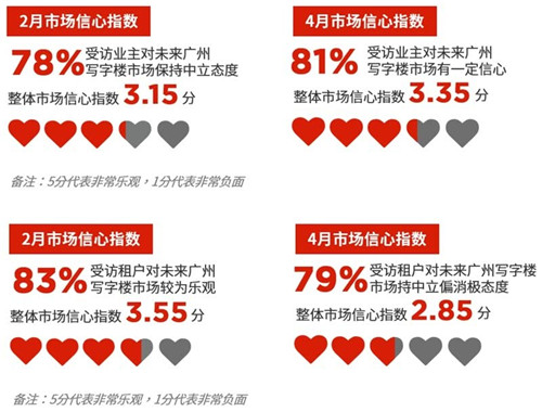 記者獲悉,在疫情防控取得關鍵進展和成果后,戴德梁行在廣州調研了甲級寫字樓市場85名業主及132名租戶。調研顯示逾8成受訪業主持積極態度,市場信心指數波動不大,但受訪租戶由2月逾8成持樂觀態度,變為4月近8成持中立偏消極態度。