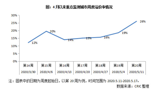 克而瑞研究中心稱,在優質土地供應開閘的影響下,今年4月份土地的溢價率在3月的基礎上再度上漲3.8個百分點,增至16.0%,創下去年7月以來新高。到了5月11-5月17日這周,土地市場周度溢價率已經升至26%,創下今年以來新高,較4月第一周的溢價率12%已經翻番。各等級城市的熱度保持空前高漲,一、二線溢價率均高達27%,三四線稍遜色,為24%。