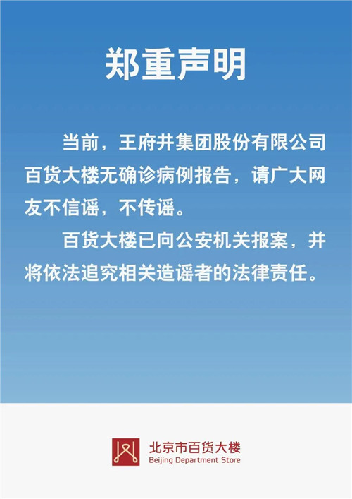 6月18日,王府井集團百貨大樓發布聲明稱,當前,百貨大樓無確診病例報告,請廣大網友不信謠,不傳謠。百貨大樓已向公安機關報案,并將依法追究相關造謠者的法律責任。(房訊網)