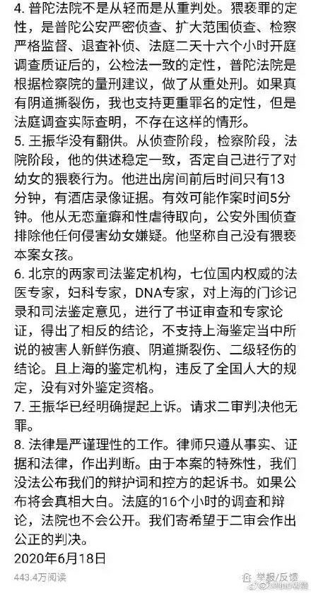 6月18日,王振華辯護律師陳有西在社交平臺發布聲明表示,王振華已經明確提起上訴,請求二審判決他無罪。
