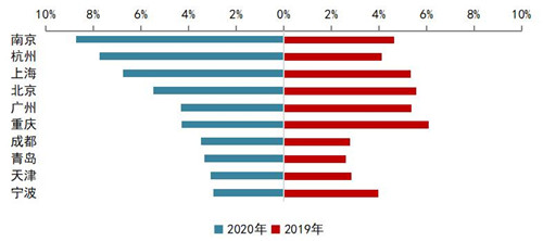 南京和杭州銷售貢獻率增長顯著。2020年上半年,20家代表企業銷售額貢獻前三城市分別為南京、杭州和上海,均位于長三角城市群,銷售額貢獻分別為8.7%、7.8%和6.8%,較去年同期分別增長4.7、3.7和1.4個百分點。20家代表企業在南京和杭州銷售額同比增長27.8%、28.1%,增速顯著。