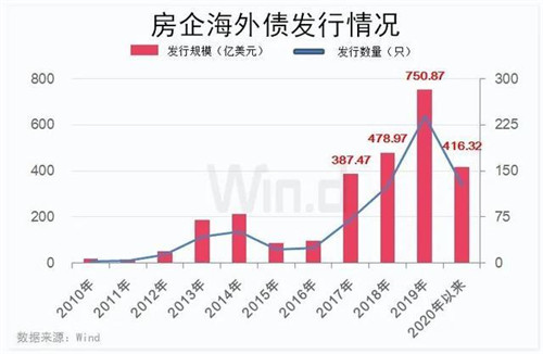 Wind數據顯示,截至7月21日,房企境外發債規模已經達到416.32億美元(約合2910.45億元),已經超過2017年全年規模,且接近2018年全年規模。