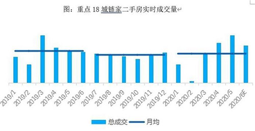 在二手房市場,3月份成交開始韌性復蘇。貝殼研究院數據顯示,重點18城鏈家二手房成交量比1-2月成交總量增長41.8%,4、5兩月環(huán)比增速分別達到39%和19%。6月成交雖然比5月有所回落,但同比依舊增加21%。