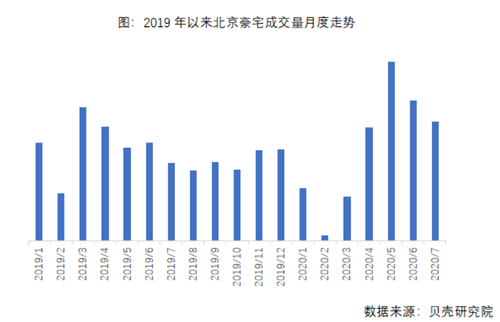 貝殼研究院數(shù)據(jù)顯示,5月二手豪宅成交量攀升至2019年以來的高點(diǎn),環(huán)比增加58%,同比增加91.7%。整體來看,2020年前7個(gè)月北京豪宅成交量基本恢復(fù)至去年同期水平,同比微幅下降1.3%。