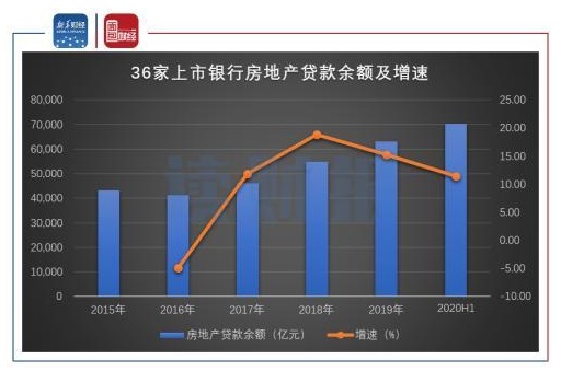 截至2020年6月末,36家上市銀行房地產業貸款余額達7.04萬億元,較2019年末增加7201.78億元,增幅為11.40%。整體來看,近幾年上市銀行房地產業貸款余額仍保持增長趨勢,但增速自2019年開始明顯放緩。