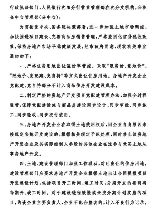 房訊網訊 9月6日,遼寧省沈陽市房產局聯合多部門發布關于《關于進一步促進我市房地產市場穩定健康發展的通知》,《通知》指出,嚴格住房用地出讓溢價率管控。采取“限房價、競地價”、 “限地價、競配建、競自持”等方式出讓住房用地。房地產開發企業競配建、競自持部分不計入商品住房開發建設成本。