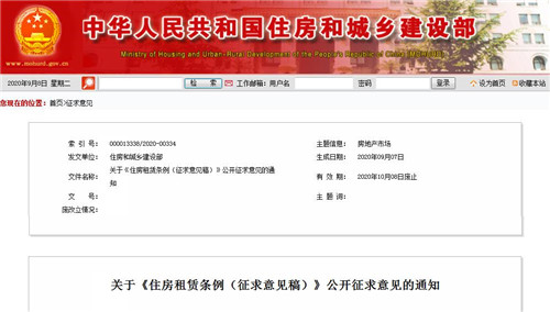 房訊網訊 9月7日,住建部關于《住房租賃條例(征求意見稿)》公開征求意見的通知,為了提高住房租賃立法質量,根據工作安排,將《住房租賃條例(征求意見稿)》向社會公開征求意見。意見反饋截止日期為2020年10月8日。《條例》包括總則、出租與承租、租賃企業、經紀活動、扶持措施、服務與監督、法律責任和附則等8章。
