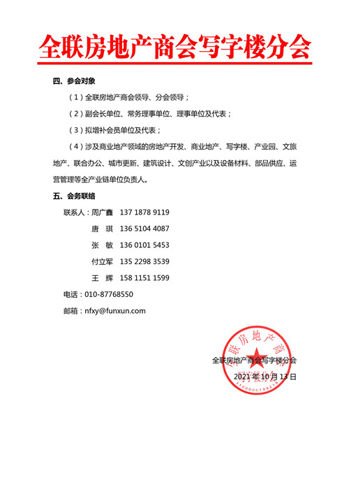 通知顯示,由全聯房地產商會、房訊網聯合主辦,寫字樓分會承辦的"中國寫字樓產業園發展論壇第十八屆年會暨寫字樓分會第二屆理事會換屆大會",將于2021年12月8-9日在北京富力萬麗酒店舉辦。