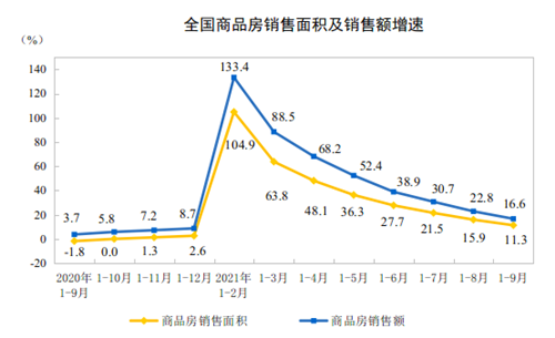 前9個月,全國商品房銷售額134795億元,增長16.6%;比2019年1—9月份增長20.9%,兩年平均增長10.0%。其中,住宅銷售額增長17.8%,辦公樓銷售額增長0.5%,商業營業用房銷售額增長0.5%。