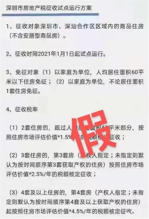 針對近日網上流傳的“深圳市房地產稅征收試點運行方案”,深圳市住建局10月26日辟謠稱,該方案為不實消息。