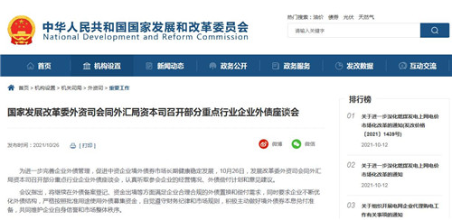 房訊網訊 發改委官網發布消息稱,10月26日,發展改革委外資司會同外匯局資本司召開部分重點行業企業外債座談會,認真聽取參會企業的經營情況、外債償付計劃和意見建議。