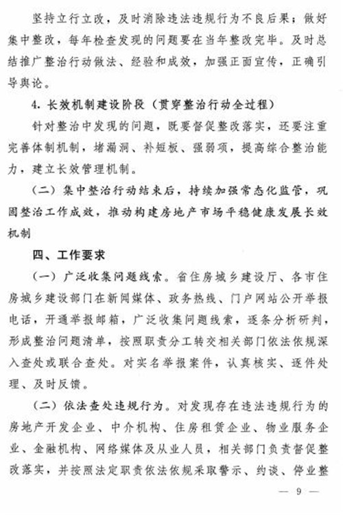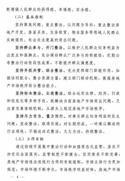 內容指出,要按照“堅持群眾參與、開門整治;堅持齊抓共管、綜合整治;堅持標本兼治、長效整治;堅持量力而為、量力而行”四項基本原則,對房地產開發領域、房屋買賣領域、住房租賃領域、物業服務領域進行重點整治。