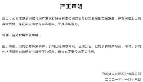 對此,藍光發展鄭重聲明:鑒于當前出現的惡意傳播事件,公司已經信息備案、證據公證,已向公安機關報案,同時,公司也將保留追究造謠者法律責任的權利。請大家不要傳遞不實信息。