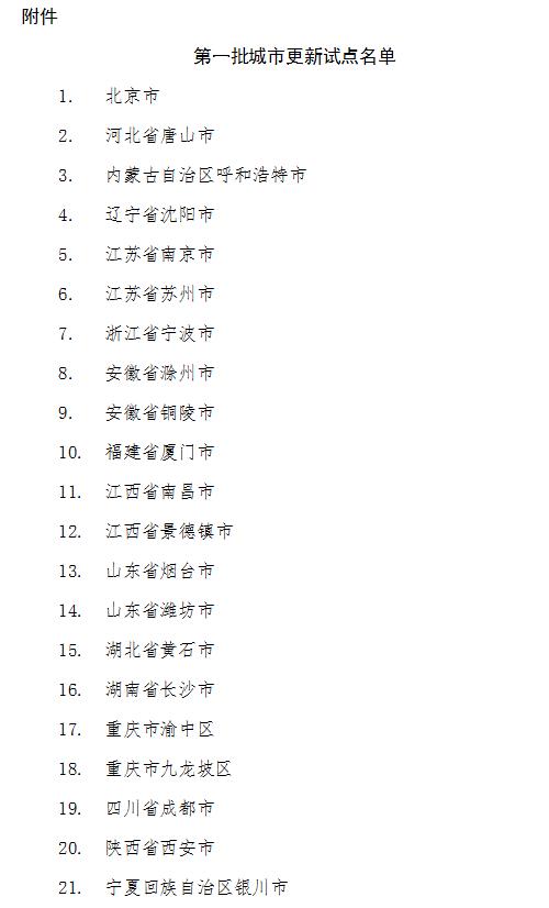 房訊網訊 近日,住房和城鄉建設部辦公廳發布《關于開展第一批城市更新試點工作的通知》,要求貫徹落實黨的十九屆五中全會精神,完整、準確、全面貫徹新發展理念,積極穩妥實施城市更新行動,引領各城市轉型發展、高質量發展,決定在北京等21個城市(區)開展第一批城市更新試點工作。