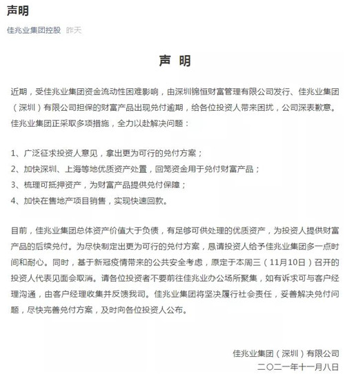 房訊網訊 11月8日,佳兆業集團發布聲明,就近期由深圳錦恒財富管理有限公司發行、佳兆業集團(深圳)有限公司擔保的財富產品出現兌付逾期,向投資人表達歉意。