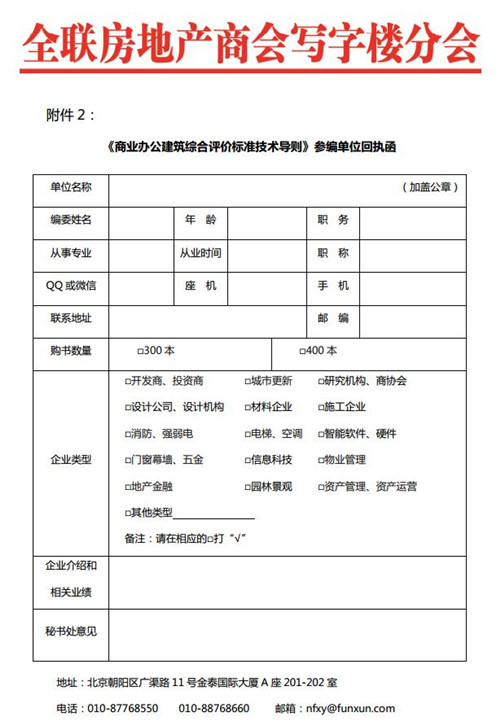 有參編意向的單位,請將加蓋單位公章的《商業辦公建筑綜合評價標準技術導則》參編單位回執函(附件 2),以電子郵件或郵寄方式,反饋至寫字樓分會。