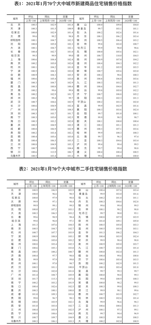 2月23日,國家統計局發布2021年1月70個大中城市商品住宅銷售價格變動情況。從全國70個大中城市房價數據看,2021年1月,70個大中城市中有53個城市的新建商品住宅價格上漲,較去年12月增加11個;二手房方面,70個大中城市中房價上漲的城市數量有49個,較去年12月同樣增加11個。