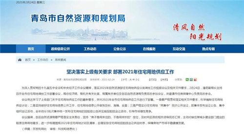 2月24日,山東省青島市自然資源和規劃局官網發布《堅決落實上級有關要求 部署2021年住宅用地供應工作》的通知。青島的《通知》顯示,2月24日,青島市自然資源和規劃局副局長潘奇主持召開青島全市住宅用地調控工作部署會議,會議傳達學習了上級部門關于住宅用地供應工作的最新要求,并對2021年全市住宅用地供應工作進行了部署。其中提到,嚴格實行住宅用地“兩集中”同步公開出讓。