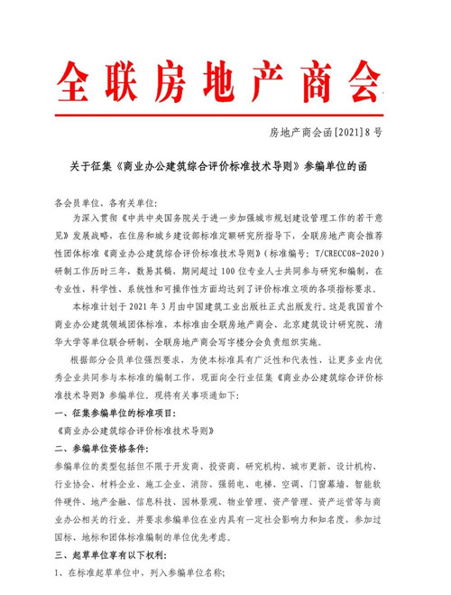 《商業辦公建筑綜合評價標準技術導則》參編單位征集函
