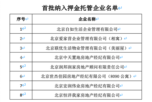 該協(xié)會還公布了首批納入押金托管的企業(yè)名單,包括北京自如生活企業(yè)管理有限公司、北京愛家營企業(yè)管理有限公司(相寓)等8家企業(yè)。