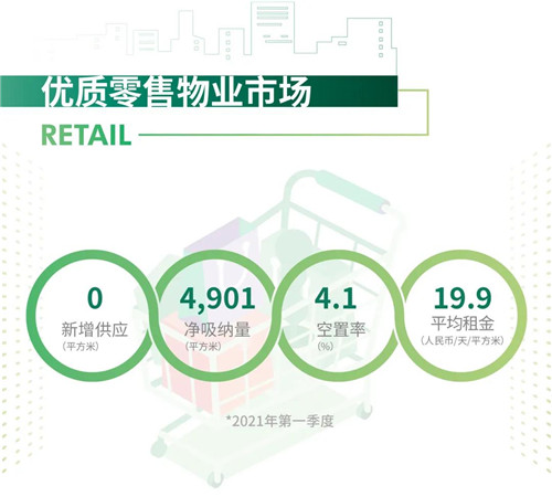2021年第一季度南京零售市場未錄得新增供應,空置率下降了0.2個百分點至4.1%。