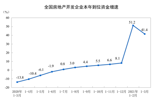 1—3月份,房地產開發企業到位資金47465億元,同比增長41.4%;比2019年1—3月份增長21.9%,兩年平均增長10.4%。其中,國內貸款7222億元,增長7.5%;利用外資11億元,下降41.0%;自籌資金13015億元,增長21.0%;定金及預收款17759億元,增長86.1%;個人按揭貸款7843億元,增長50.0%。