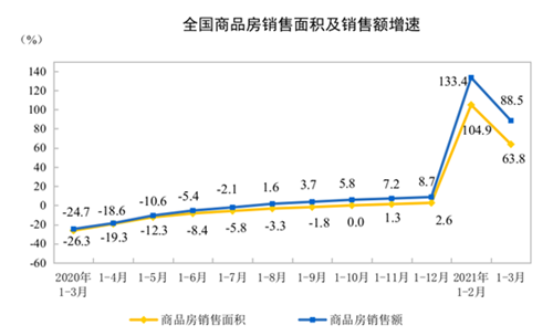 1—3月份,商品房銷售面積36007萬平方米,同比增長63.8%;比2019年1—3月份增長20.7%,兩年平均增長9.9%。其中,住宅銷售面積增長68.1%,辦公樓銷售面積增長34.4%,商業營業用房銷售面積增長24.9%。商品房銷售額38378億元,增長88.5%;比2019年1—3月份增長41.9%,兩年平均增長19.1%。其中,住宅銷售額增長95.5%,辦公樓銷售額增長44.0%,商業營業用房銷售額增長25.8%。