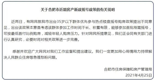 據(jù)合肥市委市政府新媒體平臺(tái)4月25日消息,合肥市住房保障和房產(chǎn)管理局當(dāng)日再度回應(yīng)近期房產(chǎn)新政搖號(hào)政策相關(guān)熱點(diǎn)。