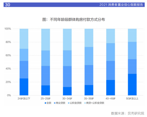 《報告》還顯示,消費客群普遍通過加杠桿方式購房,受調群體中全款購房比例僅占 18.1%。對比不同年齡段群體看,25-39歲群體對杠桿的依賴度較高,貸款購房比例超過8成,其中30-34年齡段群體貸款比例最高,達87.4%。80前群體資金積累相較充足,對杠桿的依賴度相對較低,貸款比例未超過8成。95后父母多為60、70后,而這兩代人已經有一定的財富積累,在購置房產時,有能力對子女進行資助,因此購房群體中全款購房比例相對較高。從購房群體的需求類型看,首次置業群體購房杠桿較高,貸款比例達86.6%。