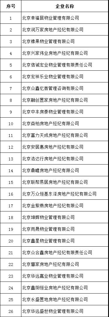 近期,北京市住建委執法部門持續著力解決好人民群眾“急難愁盼”的問題,聯合朝陽房管局、海淀房管局、豐臺房管局、通州住建委、石景山住建委、昌平住建委、順義住建委開展房地產市場檢查,線上線下兩手抓,嚴查發布委托手續不全、炒作學區房、違規商改住、違規群租、代理出租不符合交易條件房屋等違法違規行為,26家機構被查處,名單如下: