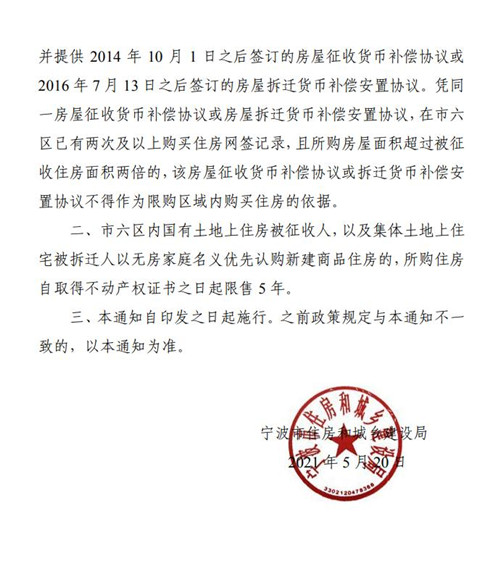 房訊網訊 5月21日,寧波市住建局發布關于明確在住房征收貨幣補償安置工作中執行限購限售政策有關事項的通知,通知提到,市六區內國有土地上住房被征收人,以及集體土地上住宅被拆遷人以無房家庭名義優先認購新建商品住房的,所購住房自取得不動產權證書之日起限售5年。