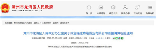 福建漳州龍海區成立工作組,對泰禾旗下一公司重整清算